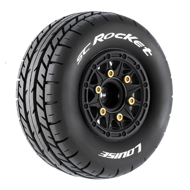 LouiseRC - T3154SB - SC-ROCKET - 1/10 Short Course Tire Set - Mounted - Soft - Black Wheels - Removable 1-10 SC Hex - 12,14,17mm