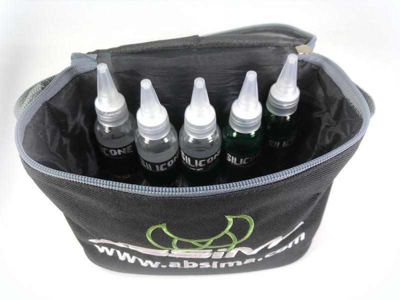 9000005 fra Absima er en taske i lækker kvalitet, til opbevaring af støddæmperolie og differentialeolie.